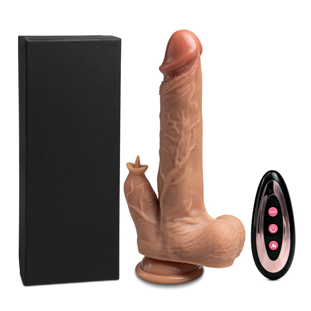 Latino Dino wireless controlled silicone rechargeable vibrating Clit & Thrusting dildo. Bunny type with clitoral stimulation point. Insertable length up to 14 cm. Diameter at max point Ø 3.7 cm. It vibrates and thrusts while it s stuck on any clean surface with it s strong suction cup base. It is offered with a heat effect. It s usb rechargeable. It can penetrade analy and vaginaly. Made of soft silicone.