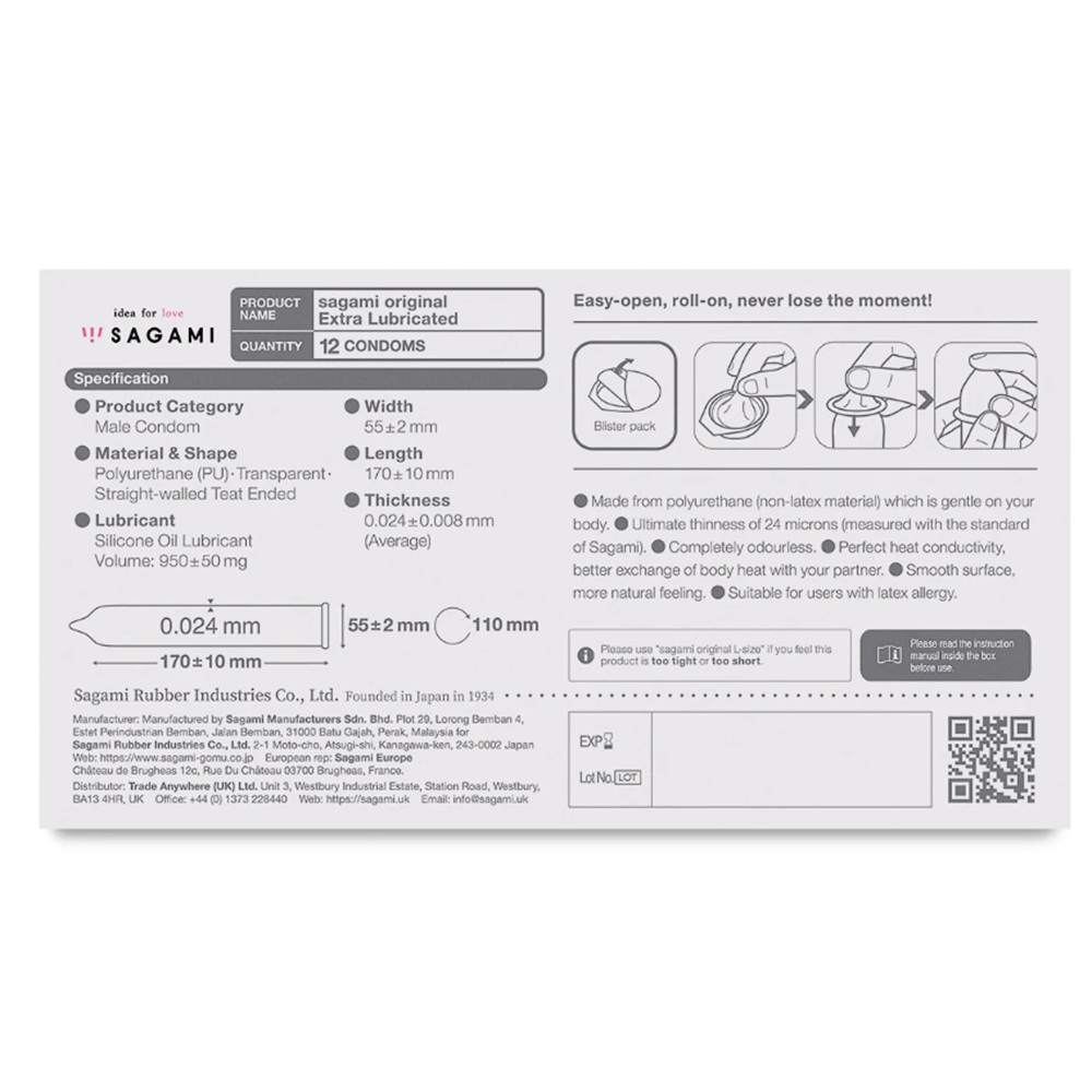 Experience ultimate intimacy with Sagami Original 0.02 Extra Lubricated – now with double the silky-smooth lubricant for maximum comfort and sensitivity. Made from ultra-thin, odorless polyurethane (just 0.02mm), these condoms transmit natural warmth, offering a feel closer to skin-on-skin contact than traditional latex. Stronger than latex and suitable for those with latex allergies, Sagami condoms are smooth, durable, and trusted as Japan’s No.1 polyurethane condom. Enjoy enhanced pleasure, safety, and peace of mind – all in one premium product.