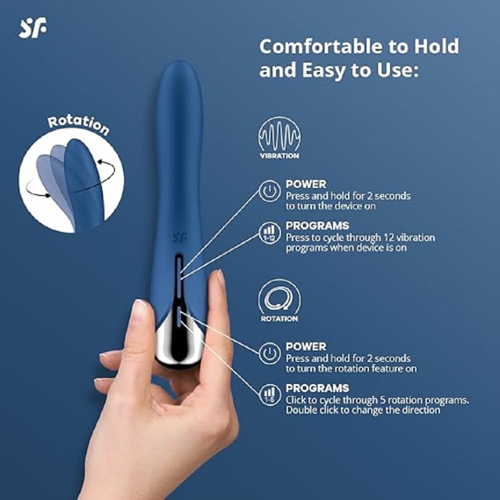 For those of you who can’t get enough of their G-spot or are just discovering it: the rotating G-spot vibrator called Spinning Vibe 1 provides an especially exciting kind of stimulation. We all know: The G-spot, it’s not just a spot – it’s more like a zone. This vibrator expertly massages it with its rotating head: the Satisfyer Spinning Vibe 1 features 5 rotation speeds (clockwise as well as counterclockwise) and only you decide whether you like it slow or fast. This kind of stimulation feels very natural – an intensely beautiful experience! Enhance this feeling by switching on the vibration: 12 vibration programs, from gentle to ultra-strong, bring your G-spot – or should we say, your G-zone – to dizzying highs. Have fun finding your favorite setting: Rotation and vibration can be controlled separately.