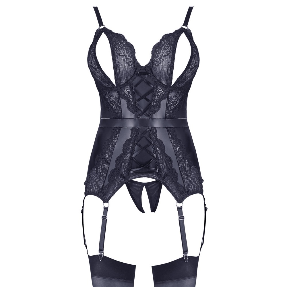 Seriously seductive shiny-matte basque with open lace cups and matching crotchless string. Enhance your lover with a sexy lingerie and drive him crazy when you wear this erotic lingerie set. Teddy lingerie with elaborate lace inserts and decorative lacing at the front. The integrated waist belt emphasizes the feminine curves. The included matching string is crotchless.