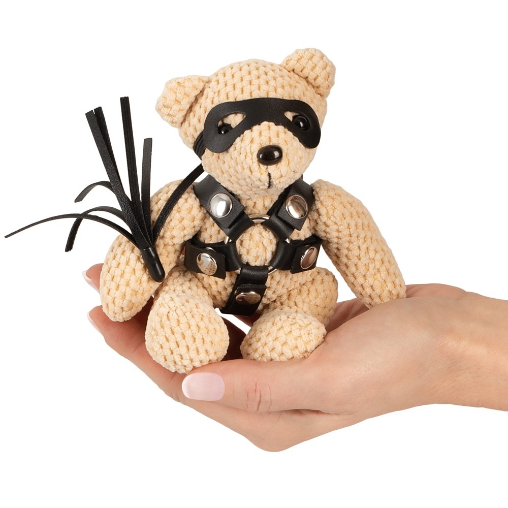This small, tame SM Teddy from Bad Kitty is in a typical SM look with a harness, eye mask and mini flogger. It’s also in a crocheted look. The teddy is very soft to the touch too. There is a keyring chain on its head. The SM accessories are made out of black imitation leather in a realistic style.