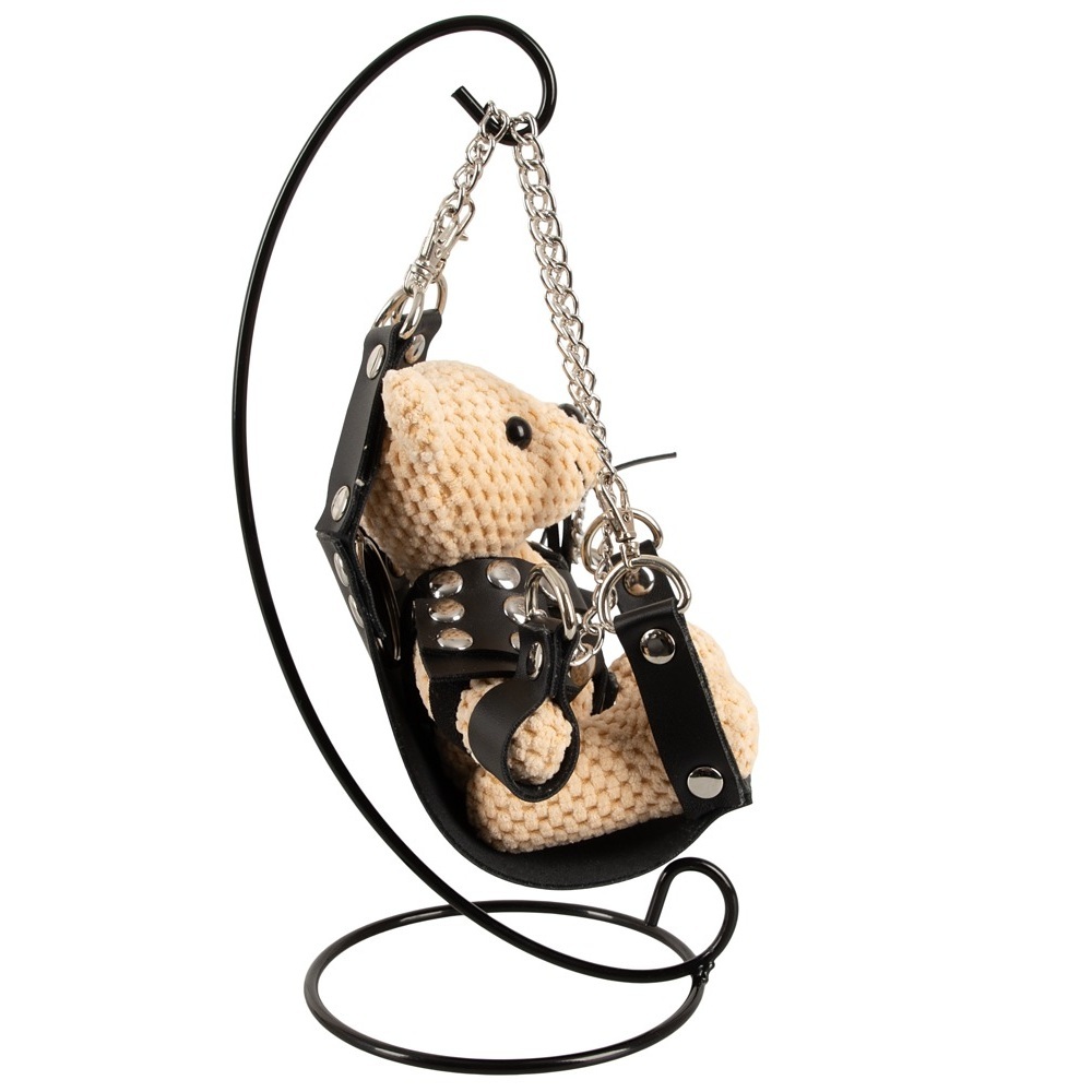 This small, tame SM Teddy with Swing from Bad Kitty is in a crocheted look and is very soft to the touch as well. It is in a typical SM look with a harness, restraints and mini flogger, which are all made out of black imitation leather. There is a keyring chain on its head. The small realistic seat is simply hooked into the mini sex swing’s metal frame – then Teddy can take a seat…