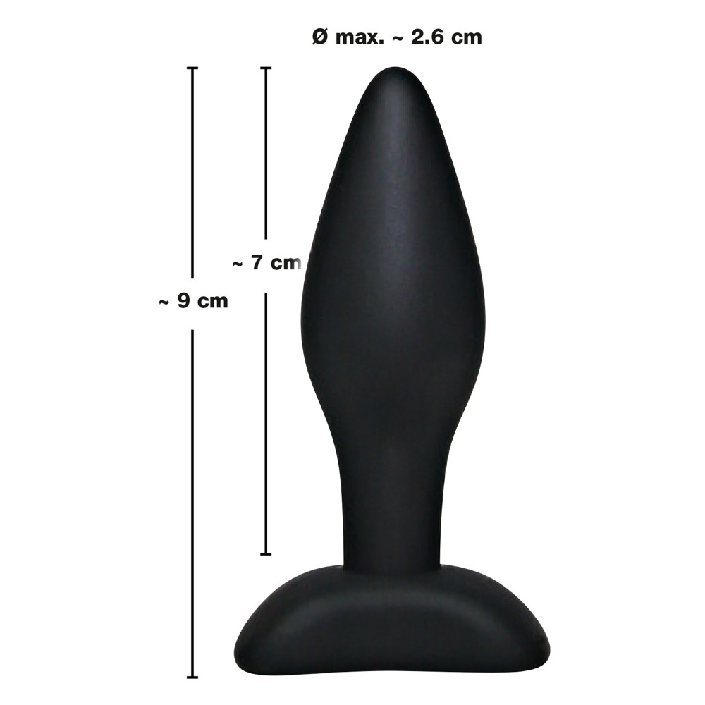 Very small, with ergonomically shape, anal plug made for beginners – Men or women. Total length 9 cm, insertion depth 7 cm, diameter Ø max. 2.6 cm. Made of body safe silicone. The velvety soft Butt plug Small from Black Velvets is in a cone-shape with a gentle tip. Its wide, easy-to-hold stopper means that it is great for anal-safe use because it stops it from sliding in too far. It is made entirely out of silicone for easy insertion. The material also means that it adapts to the body perfectly and it is also very comfortable to wear as well.