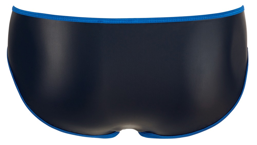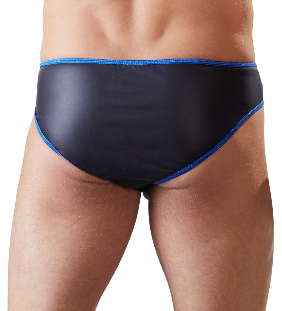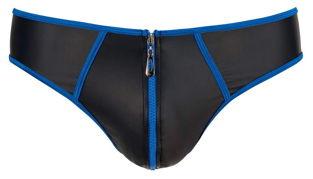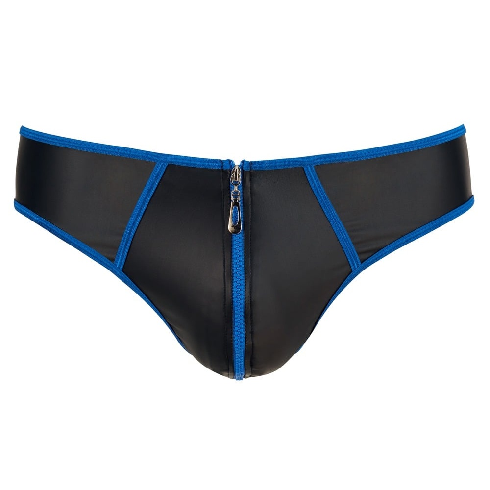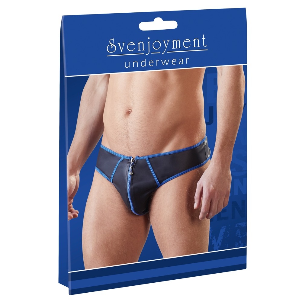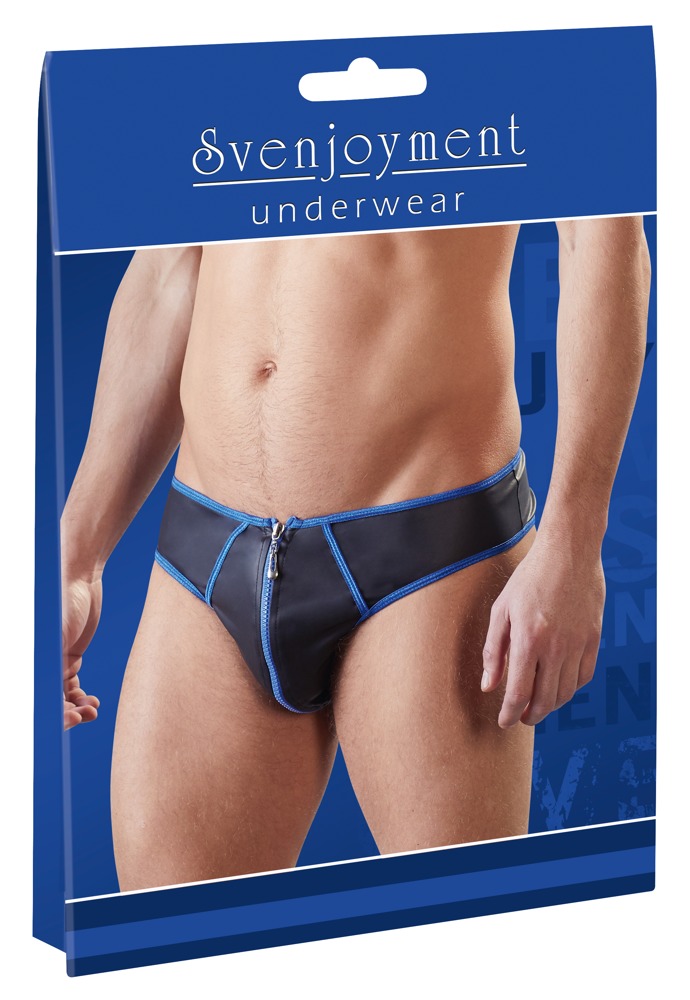 Svenjoyment Male Sexy brief to project your manhood. Slightly stretchy matte look black with stitched seams and a zip in a contrasting blue colour. Fits and feels so great!