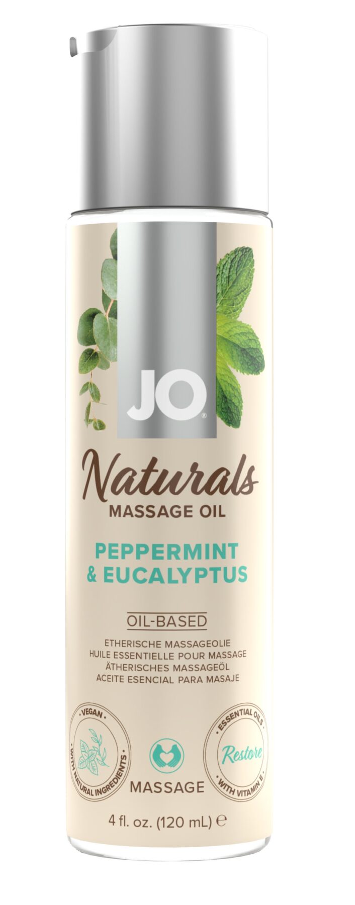 System Jo Naturals Massage oil Peppermint and Eucalyptus 120 ml. JO Naturals Essential Massage Oils are carefully balanced, created by adding uplifting essential oils to a blend of natural, nourishing, and vitamin rich oils. Let the fragrant undertones fill your senses, dive deeper into your massage, and leave you feeling positive and refreshed.
