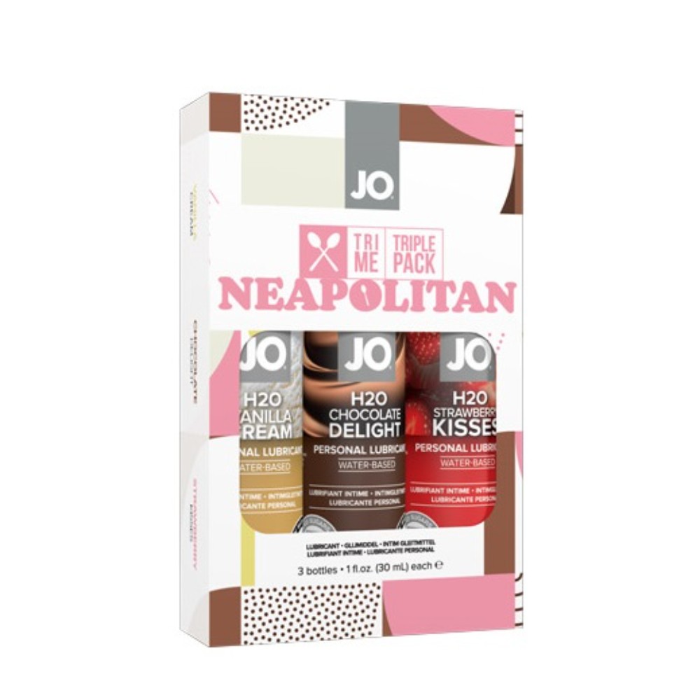 The System JO Tri me Triple Pack Neapolitan is a collection of flavored lubes gives you the latest scoop on sensuality. Everyone’s favorite ice cream combo includes three 30ml bottles of these amazing formulas: Strawberry Kisses, Vanilla Cream, and Chocolate Delight. All three water-based lubricants feature System JO famous comforting glide and silky-smooth feel. Whether you choose to taste one at a time or combine them into one flavor-packed experience, this pack will take you straight to summertime fun.