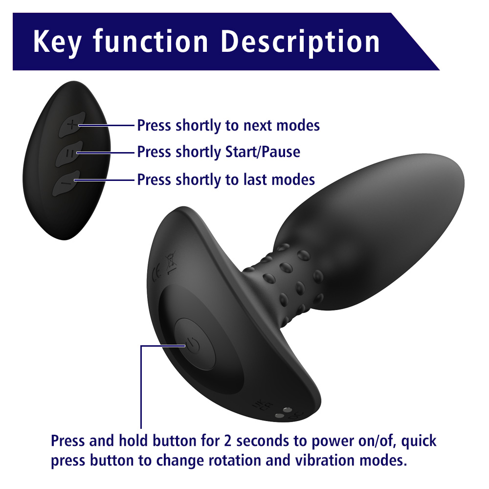 Thanks to the remote control, your partner or yourself can easily control the 7 vibration and rotation modes to vary pleasure, even in running water, because the SPIN PLUG is IPX6 waterproof.