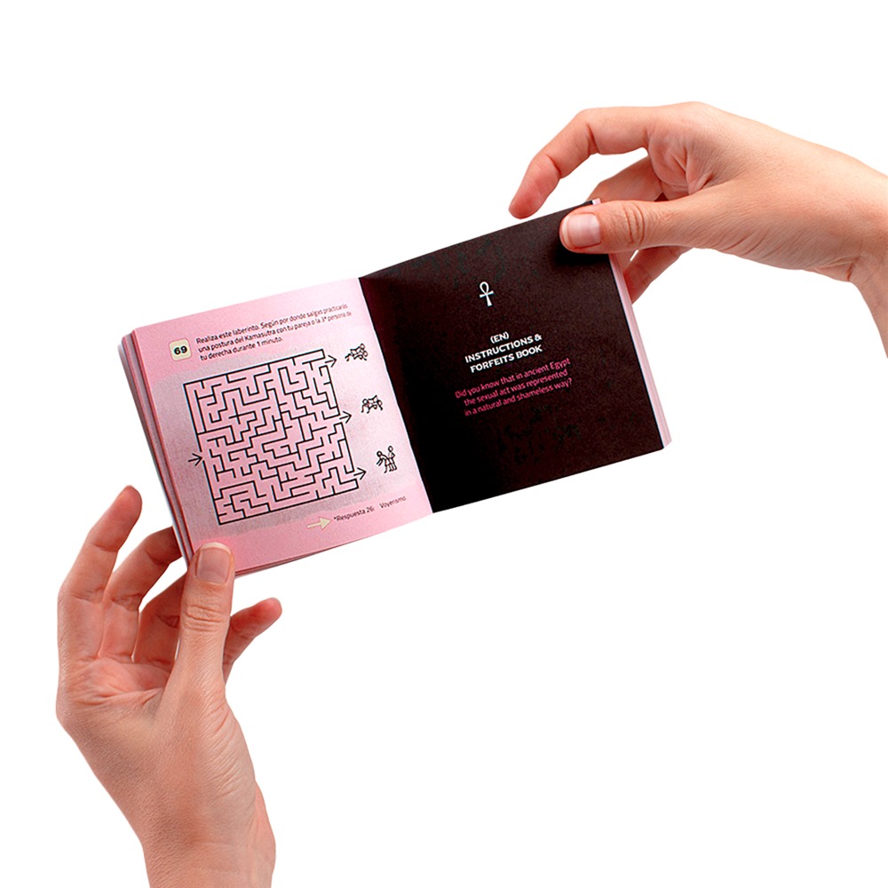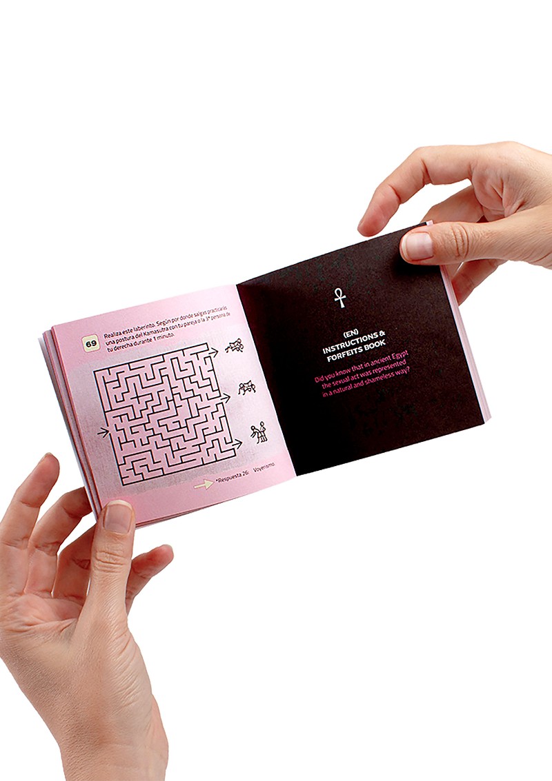 The booklet includes a combination of logical tests and spicy challenges that will increase in intensity as the game progresses. The player who doesn’t fulfil the proposed challenge will not take part in the next round. The hourglass must be used to measure 1 minute for the challenges that require so, and if 2 or more minutes are required it will be flipped as many times as necessary. Once the test has been performed and fulfilled, it’ll be the turn of the player to the left.