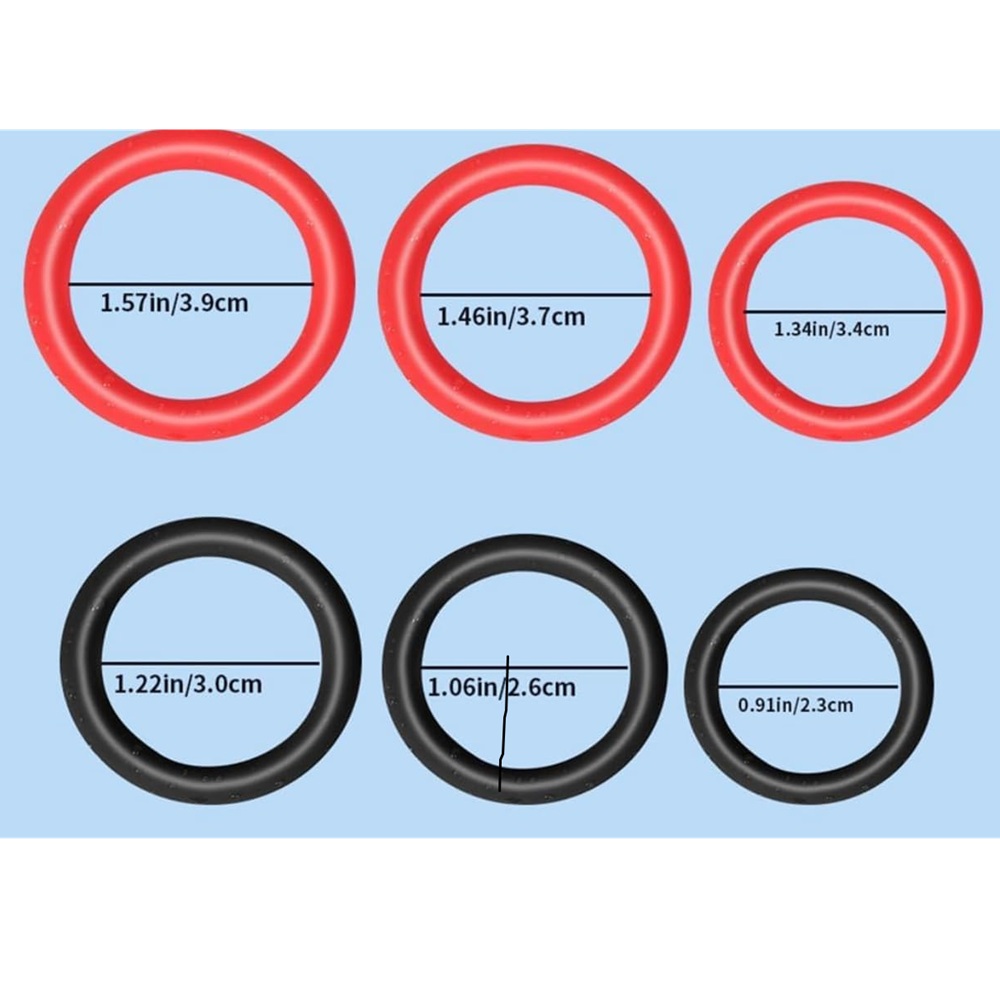 Silicone Penis Rings combo set with 6 different sizes penis O-rings in combination 3 neck type cock and balls rings. Made of silicone, stretchable but sturdy enough and is quite soft and bouncy. O-RINGS Diameter goes as Ø 2.3 cm, Ø 2,6 cm, Ø 3 cm, Ø 3.4 cm, Ø 3.7 cm, Ø 3.9 cm. Ideal for men with small up to medium plus size penis.