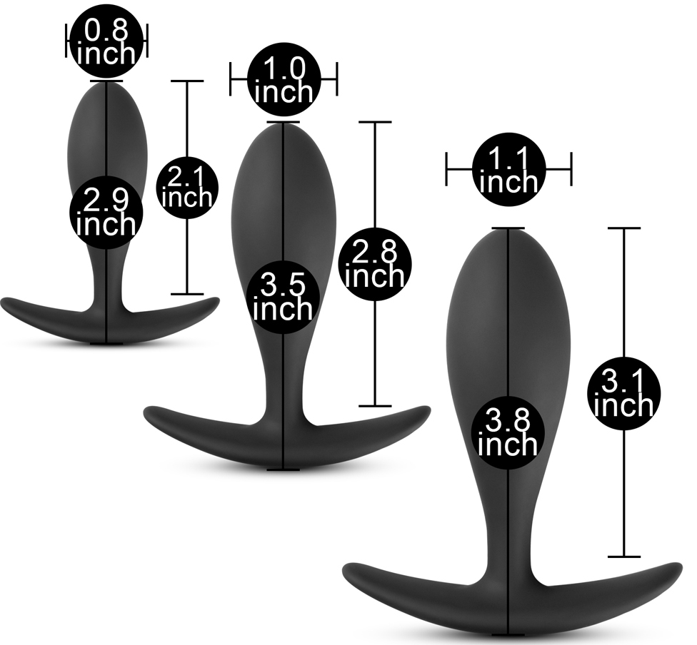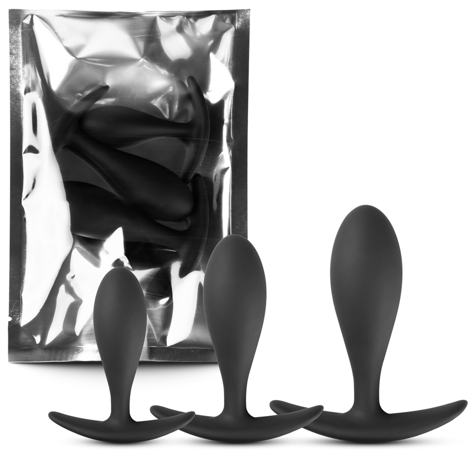 TOYBOY Black Silicone T-Base Butt Plug SET is a complete trainer kit with 3 (three) super soft and bendable black silicone butt plugs with T shape end stopper to prevent further insertion into the anus. Anatotomical shape for 1) Easy insertion and 2) to remain into the butt all day long since products are made out of Silicone material.