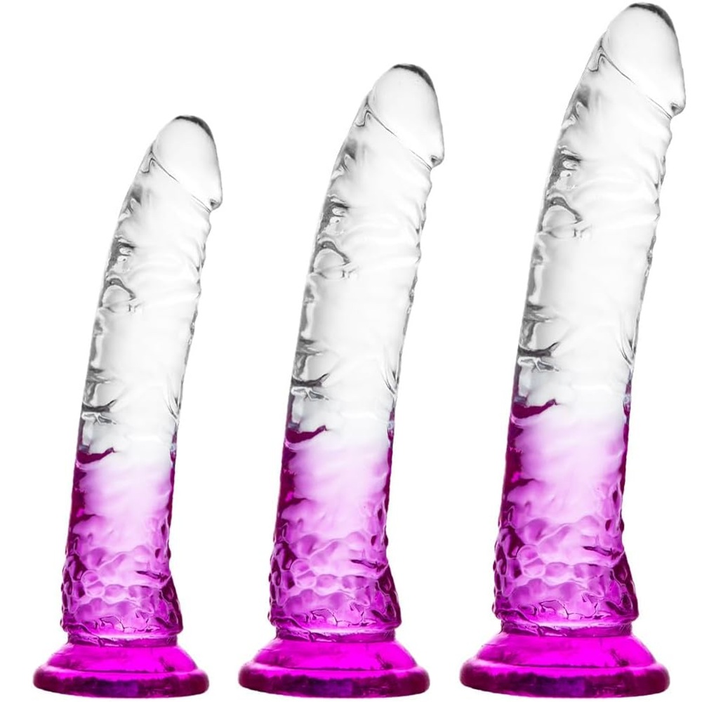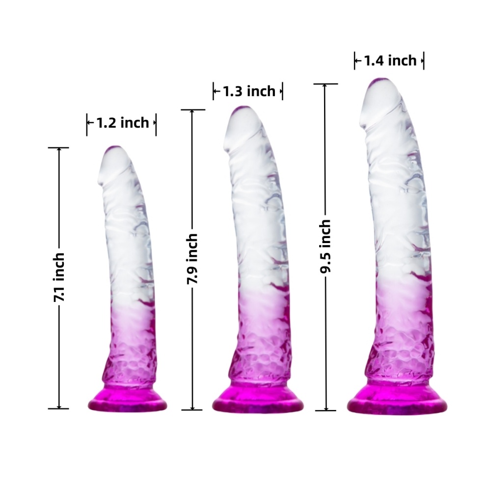 Gradient Clear Purple Combination Suction Cup Dildo – 3 Sizes (Small, Medium, Large). Clear and Purple color combination with Suction Cup for Hands Free Play. Ideal for any and every thought and fantasy. Perfect for both genders, Vaginal and anal Pleasure. This set is suitable for beginners to advanced sex toy users.