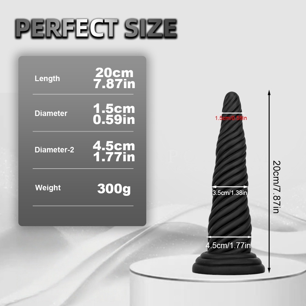 TOYBOY Deep Bottom ROCCO is a black conical and spiral silicone Plug with suction cup base. Designed for very demanding boys and girls. Total length: 20cm (7.88”) – insertable useful length: 18cm (7.09”)- diameter: 4.5cm (1.77”). It has a twisted spiral design that makes anal and vaginal penetration easy. Made with high quality soft, body-safe silicone. It’s conical shape makes anal play easy and joyful. Combine with any good quality water-based lubricant and feel Deep Bottom ROCCO to the end.