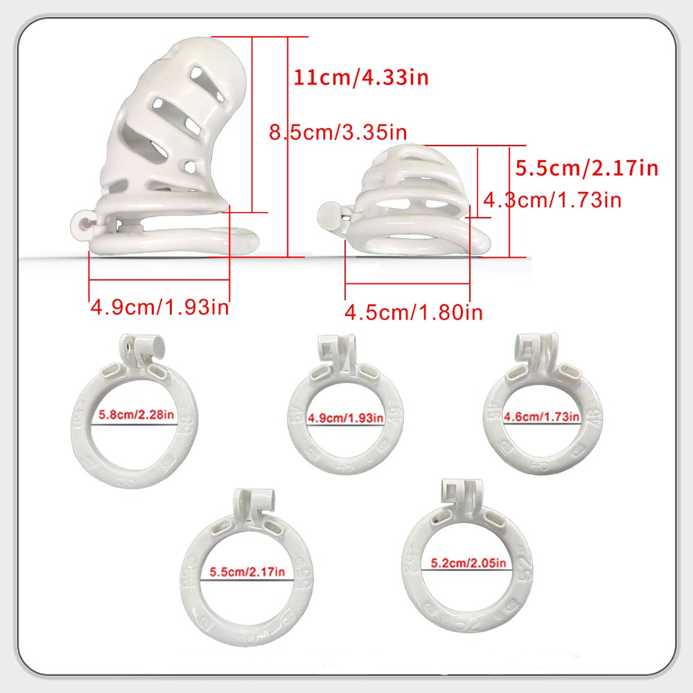 Set of 2 Different Sizes of Chastity Cages: Chastity cage set includes 2 different sizes of penis cages with length of 1.73in/3.35in (43mm/85mm) and inner diameter of 1.80in/1.93in (45mm/49mm). Each set of chastity cage contains 5 different ring sizes: 1.73in/1.93in/2.05in/2.17in/2.28in (46mm/49mm/52mm/55mm/58mm) , you can match the right cage and ring to your penis size.