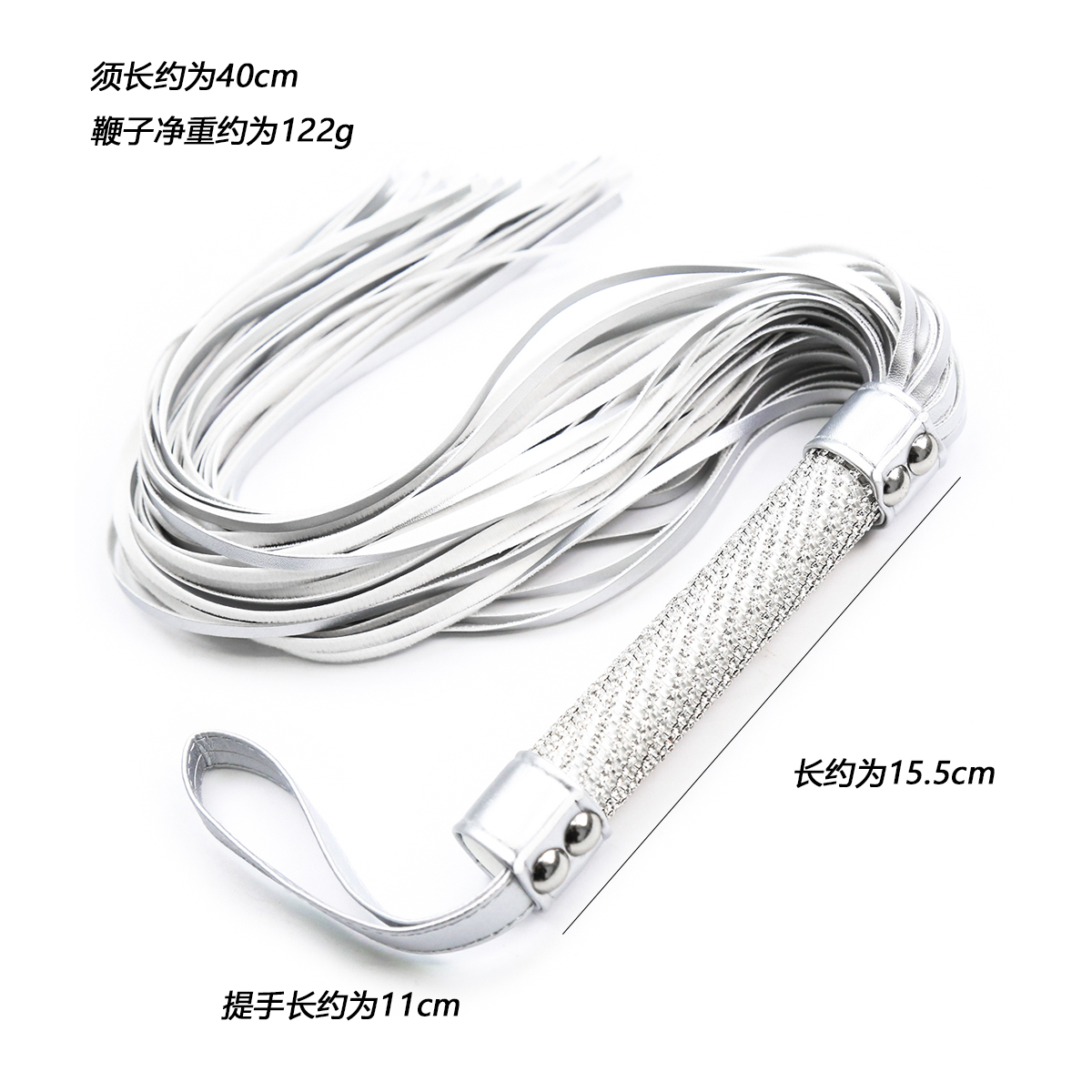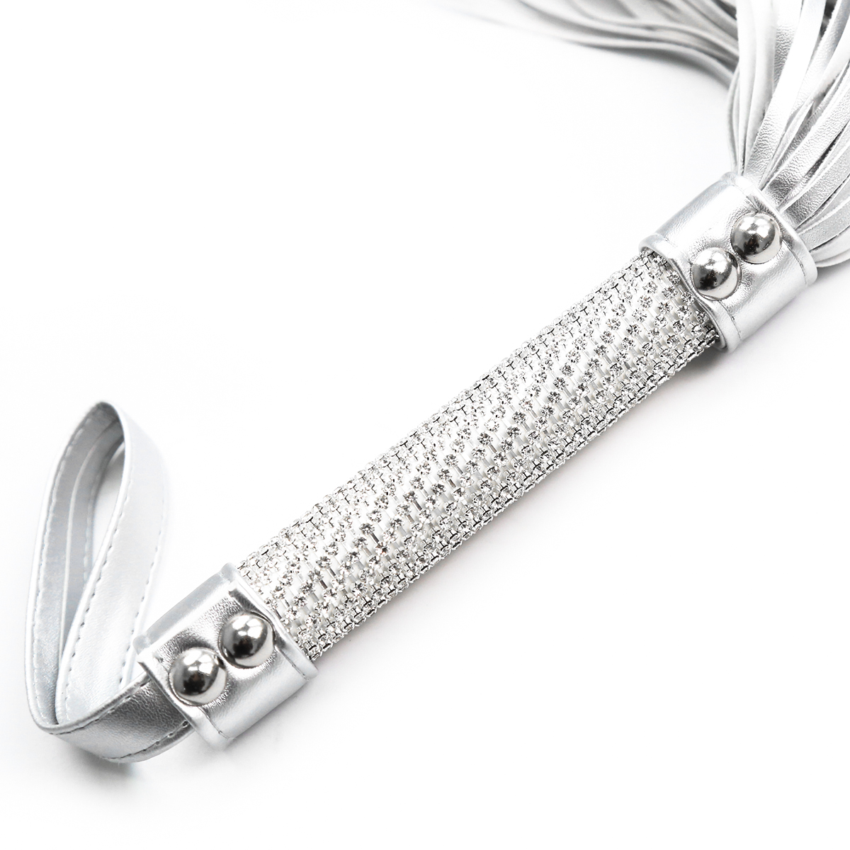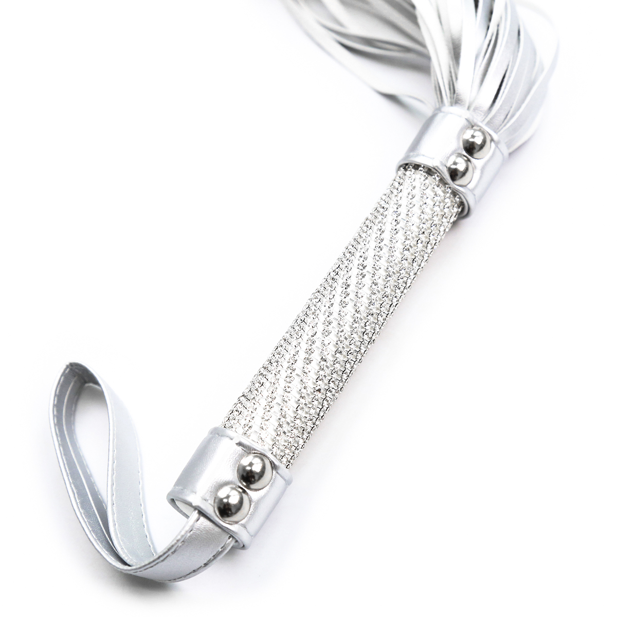 Naughty Toys White silverish imitation leather exclusive exotic design Bdsm Bondage flogger with white handle grip full of “crystal clear diamonds”. The handle is almost covered completly with exotic embossed surface (diamond cut).